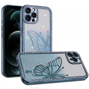 For iPhone 12 Pro Max 6.7 Electroplated Butterfly With Diamonds Glitter Shimmer Hybrid Case - Blue