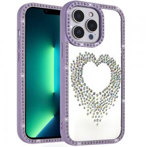 For iPhone 13 Pro Max Beautiful ANGEL Hearts Glitter Shimmer Diamond Edged Hybrid Case - Purple