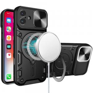 For iPhone 16 6.1 inch Metal Chrome Kickstand [Magnetic Circle] Shockproof Matching Camera Hybrid - Black