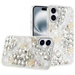 For iPhone 16 Plus 6.7 inch Butterfly Ornaments Diamond Bling Glitter Hybrid Case - White