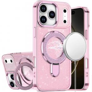 For iPhone 17 Pro Transparent Glitter Rotaional Magnetic Ring Stand HQ Hybrid - Light Pink