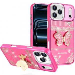 For iPhone 17 Pro Splendid Glitter Butterfly Design Stand with Metallic Edges Hybrid Case - Hot Pink