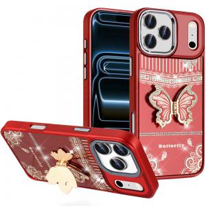 For iPhone 17 Pro Splendid Glitter Butterfly Design Stand with Metallic Edges Hybrid Case - Red