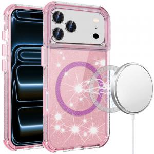 For iPhone 17 Pro Max Magnetic Ring Glitter 3in1 Hybrid Case Cover - Pink