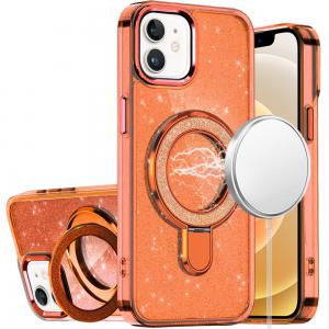 For iPhone 12 & iPhone 12 Pro Transparent Glitter Rotaional Magnetic Ring Stand HQ Hybrid - Cosmic Orange