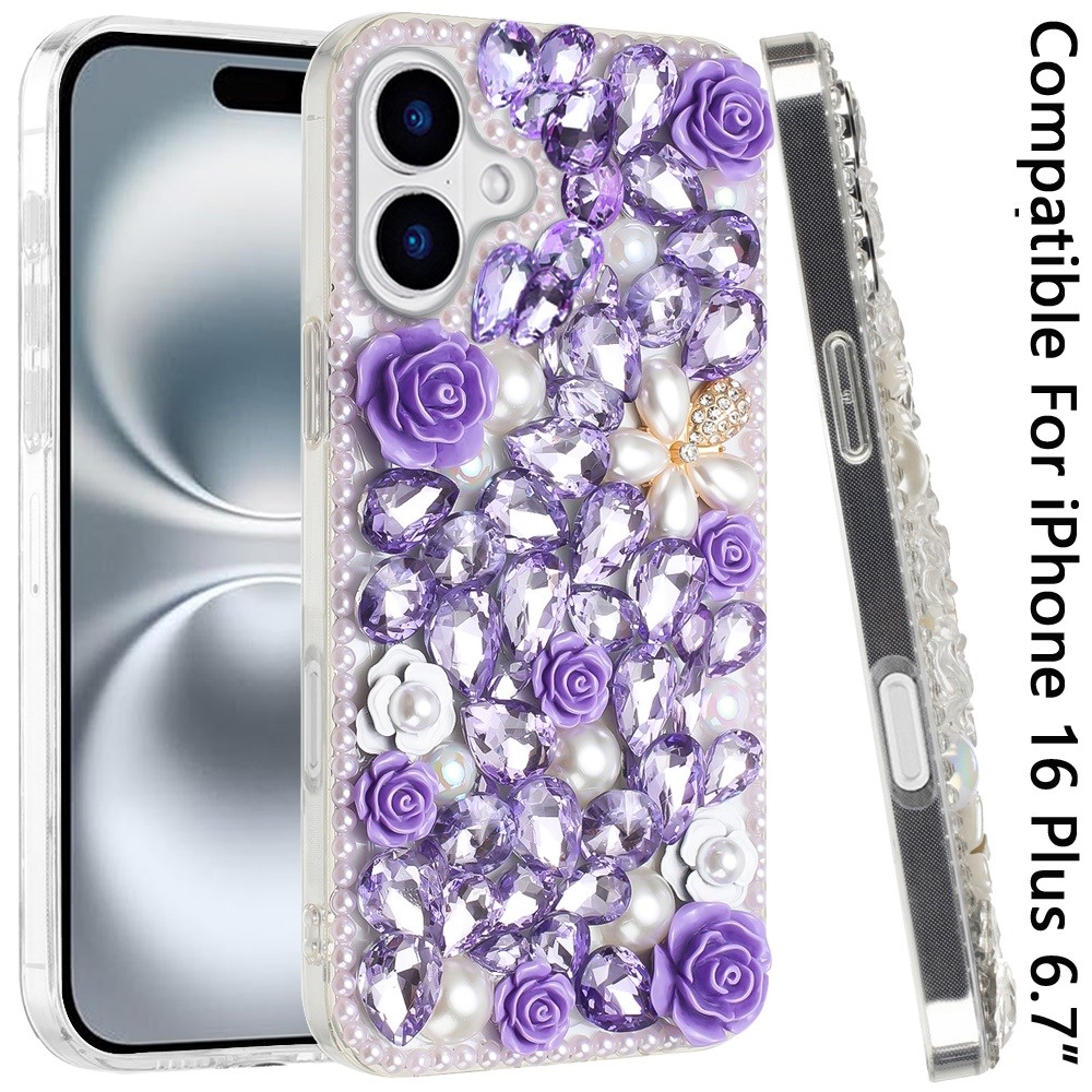 For iPhone 16 Plus 6.7 inch Rose Flower Full Diamond Bling Stones - Purple