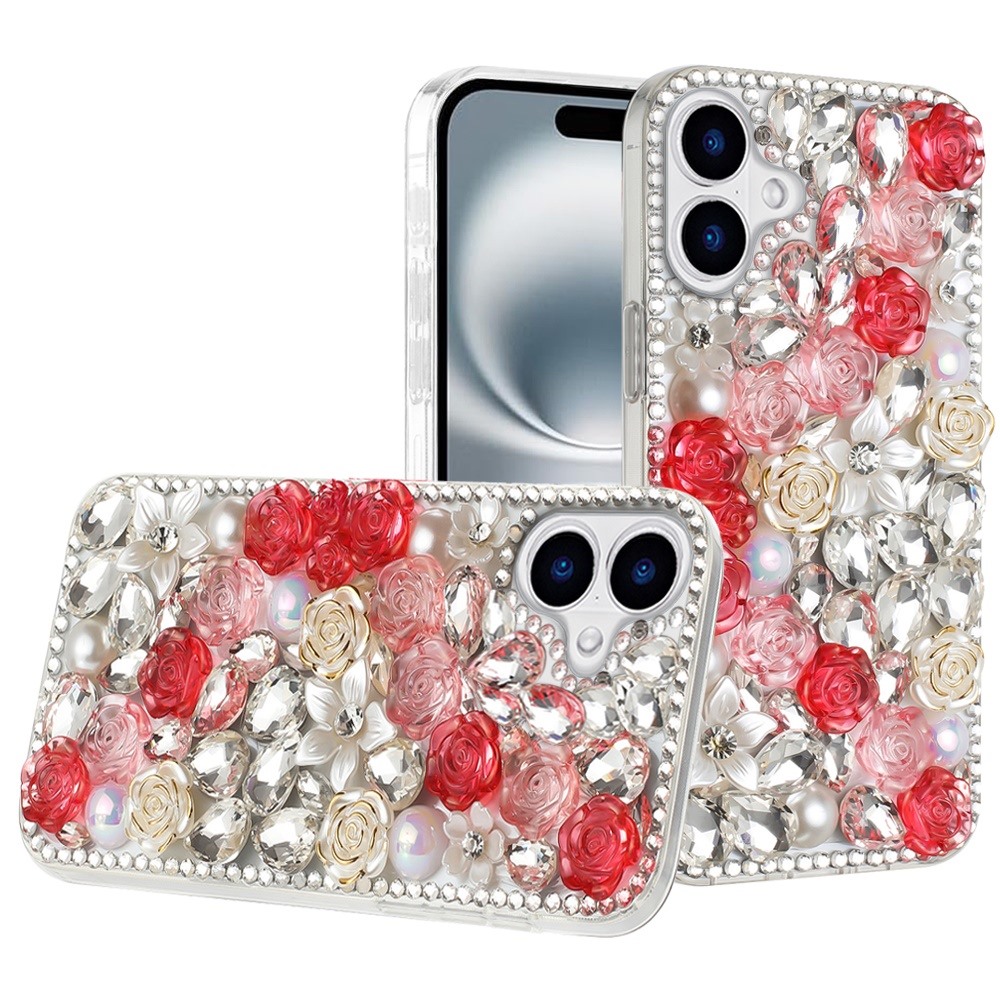 For iPhone 16 Plus 6.7 inch Rose Flower Full Diamond Bling Stones - Red