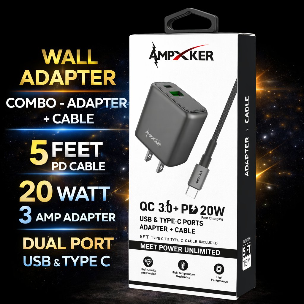 COMBO - USB & Type C - Dual Port - UL Certified Adapter + 5 Feet Cable - QC 3.0 Amp + PD 20W - BLACK (LANE A6) (item#8)