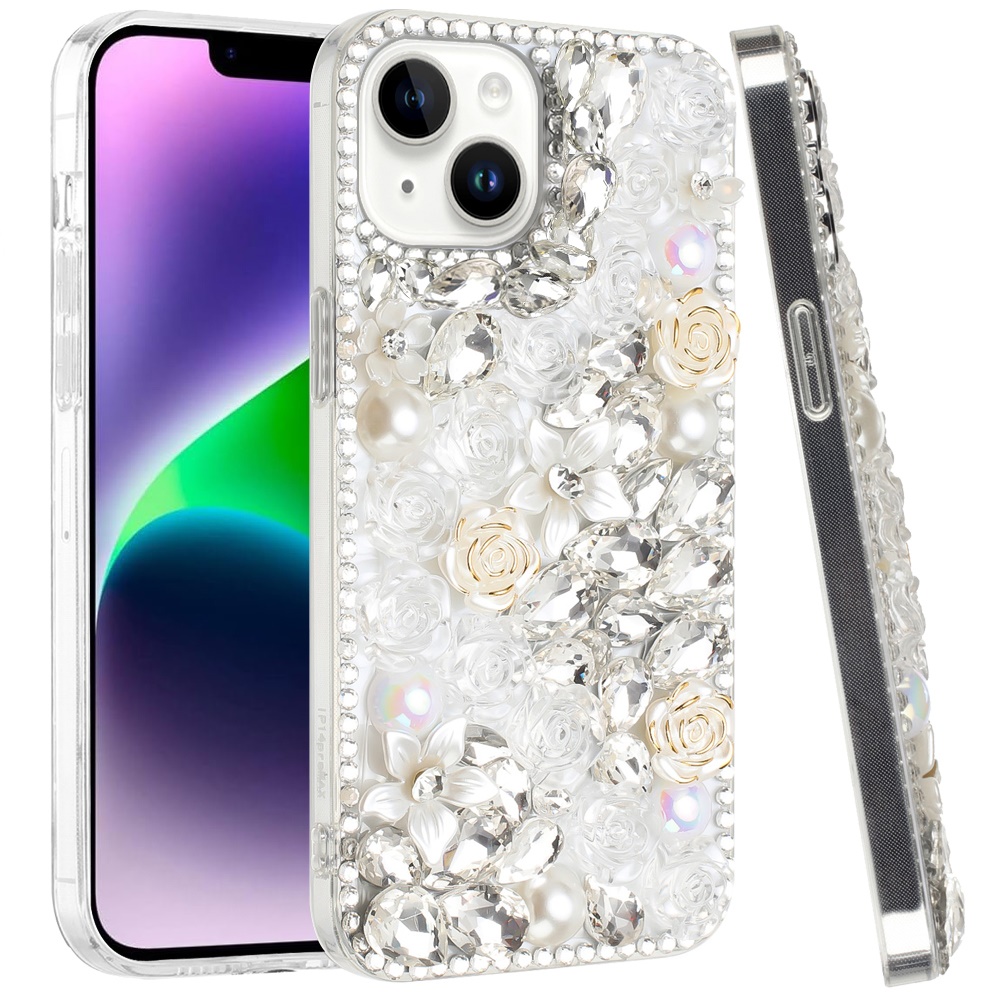 For iPhone 14 6.1" Rose Flower Full Diamond Bling Stones - Clear