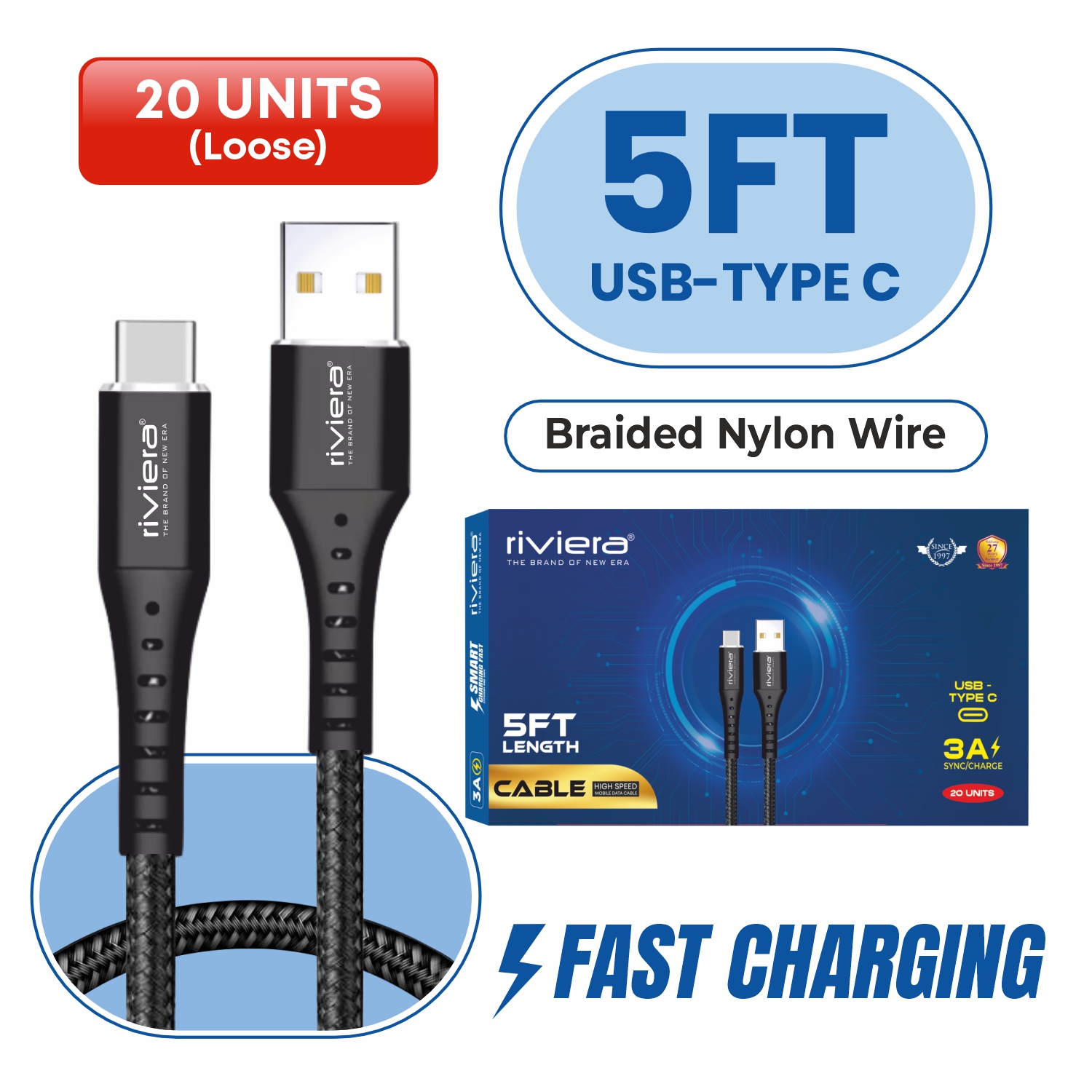 Pack of 20 // CLEARANCE [Samsung A Series Only] [Not for iPhones] - 5FT [USB - Type C (PD)] Nylon Braided - Black w/ Black Shell (32)