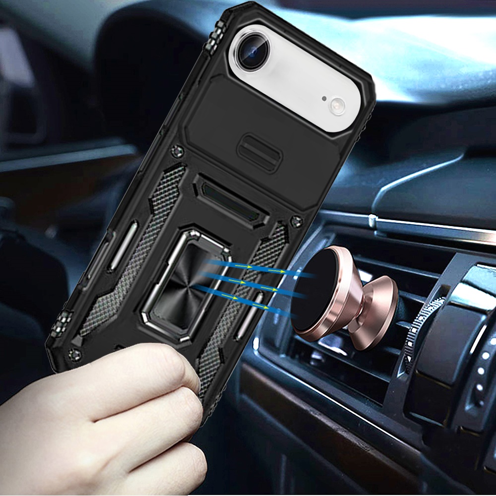 For iPhone 17 Air Utter Tough Metal Ring Movable Camera Window Hybrid Case Cover - Black