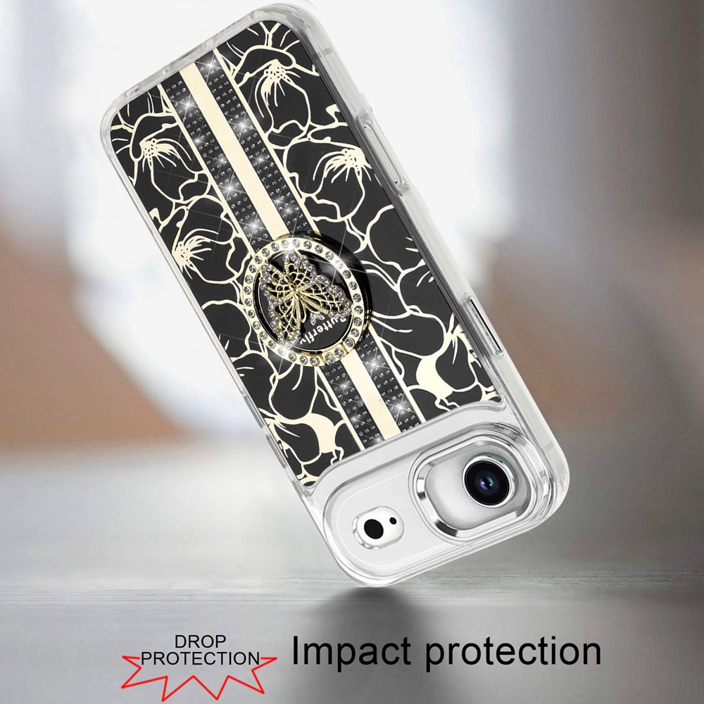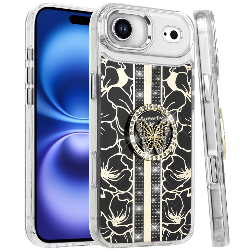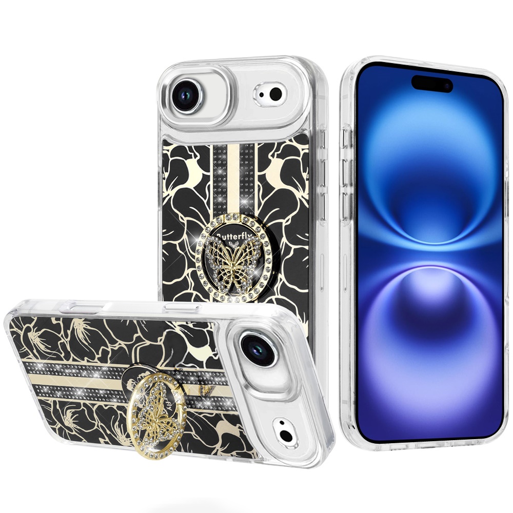 For iPhone 17 Air Splendid Floral Designs with Metal Camera and Buttons with Butterfly Ring Stand Hybrid Case - Black