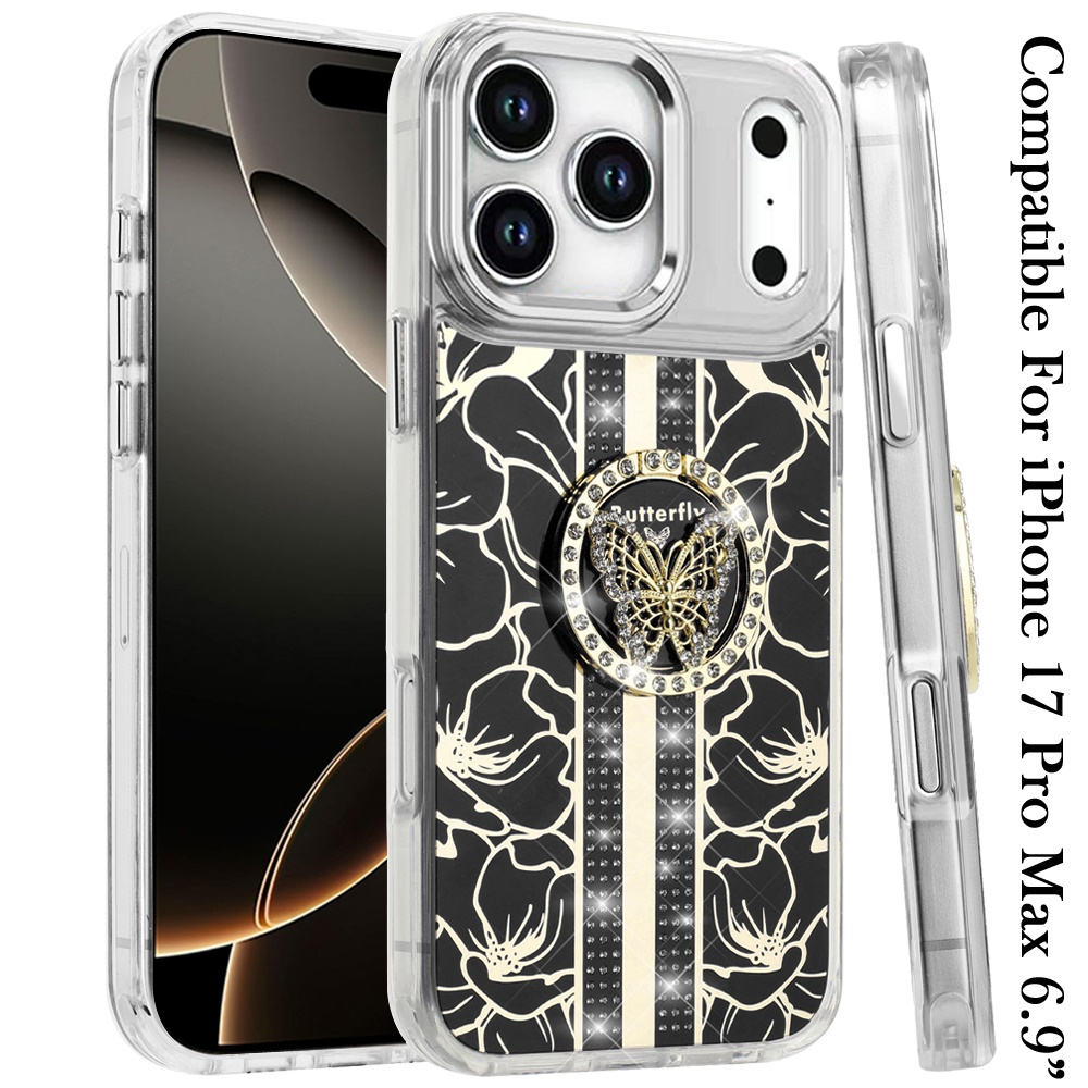 For iPhone 17 Pro Max Splendid Floral Designs with Metal Camera and Buttons with Butterfly Ring Stand Hybrid Case - Black