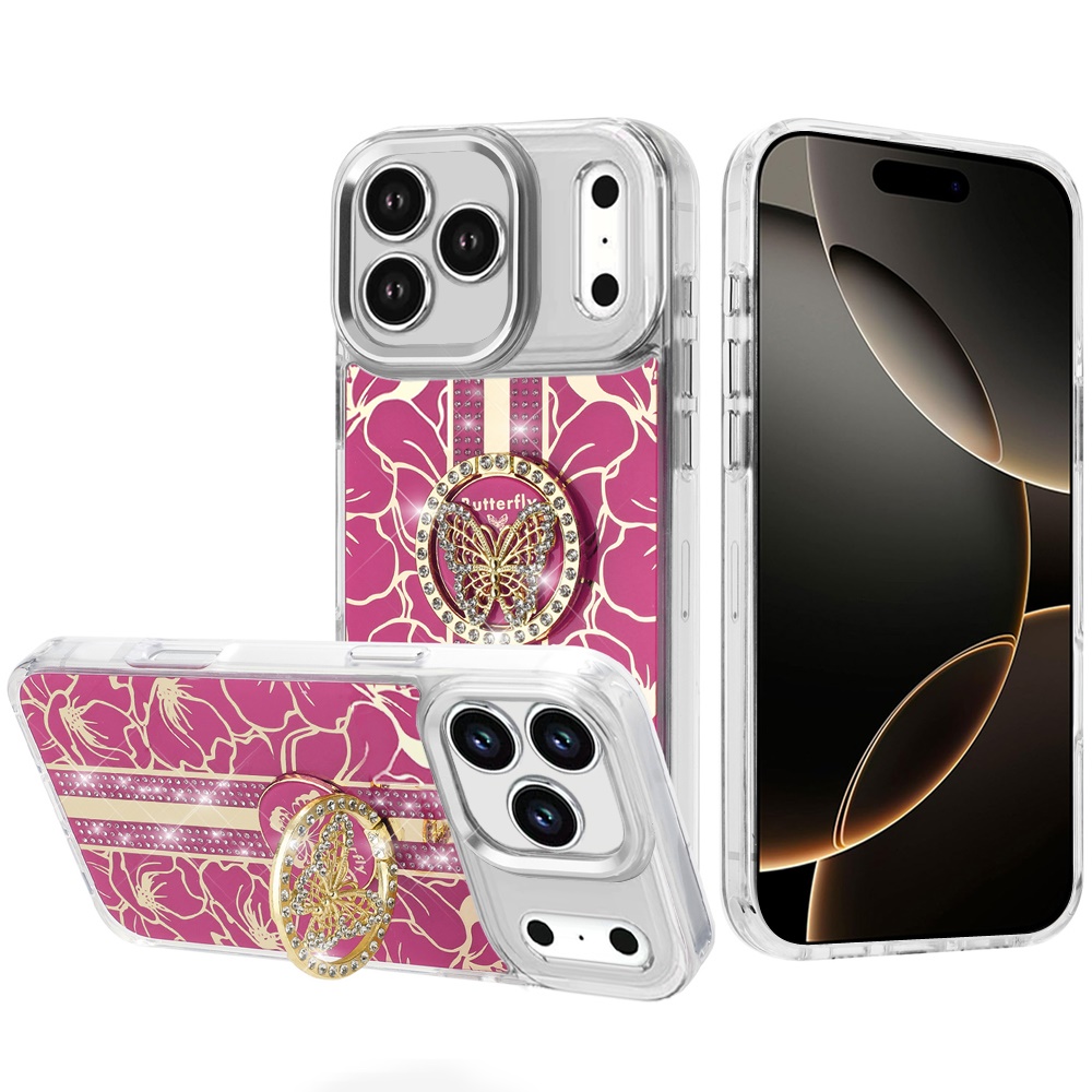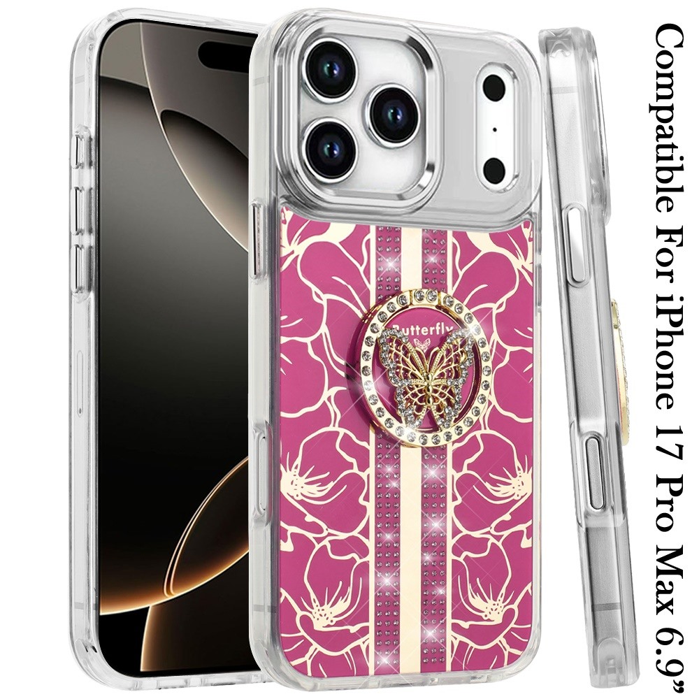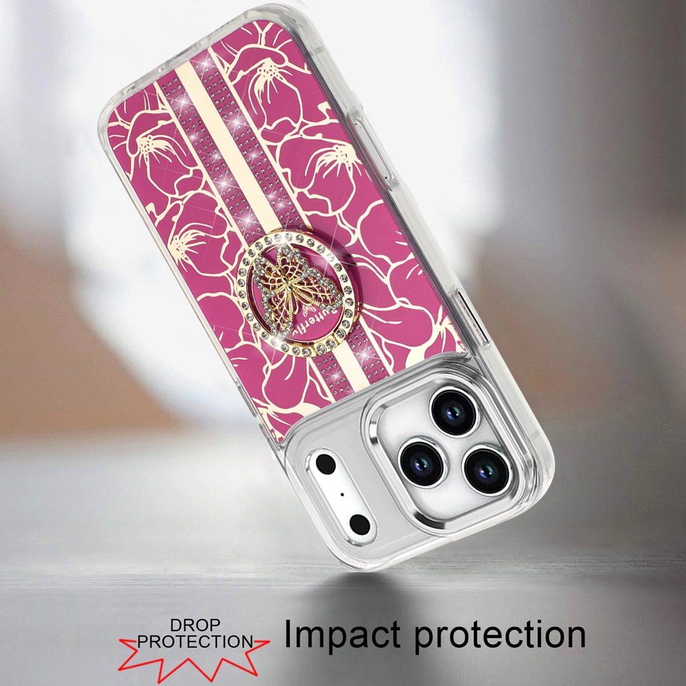 For iPhone 17 Pro Max Splendid Floral Designs with Metal Camera and Buttons with Butterfly Ring Stand Hybrid Case - Hot Pink