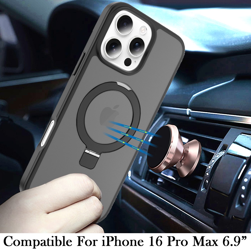 For iPhone 16 Pro Max 6.9 Magnetic Matching Ring Stand Full Rotation Matte Hybrid - Black