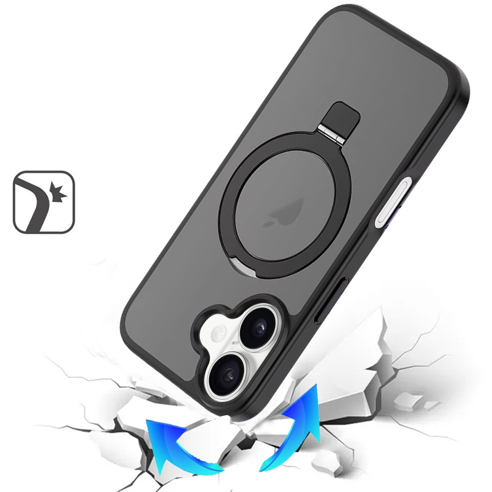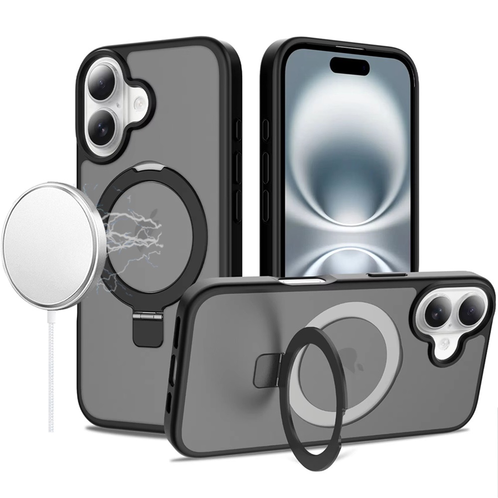 For iPhone 16 6.1 inch Magnetic Matching Ring Stand Full Rotation Matte Hybrid - Black