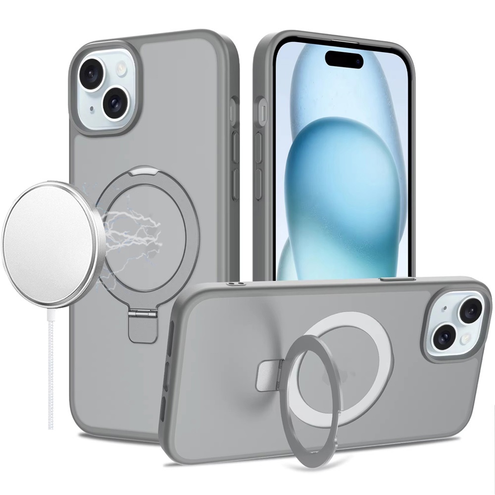 For iPhone 15 Plus/iPhone 14 Plus Magnetic Matching Ring Stand Full Rotation Matte Hybrid - Grey