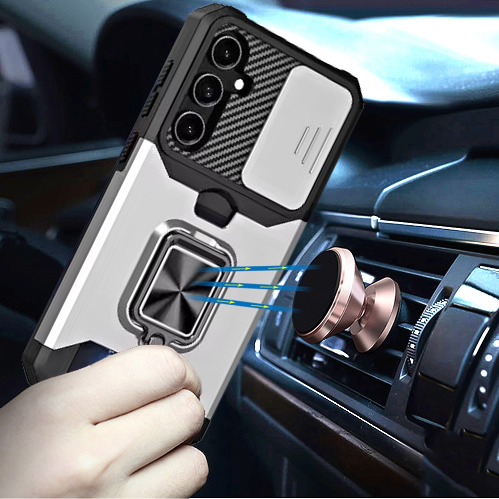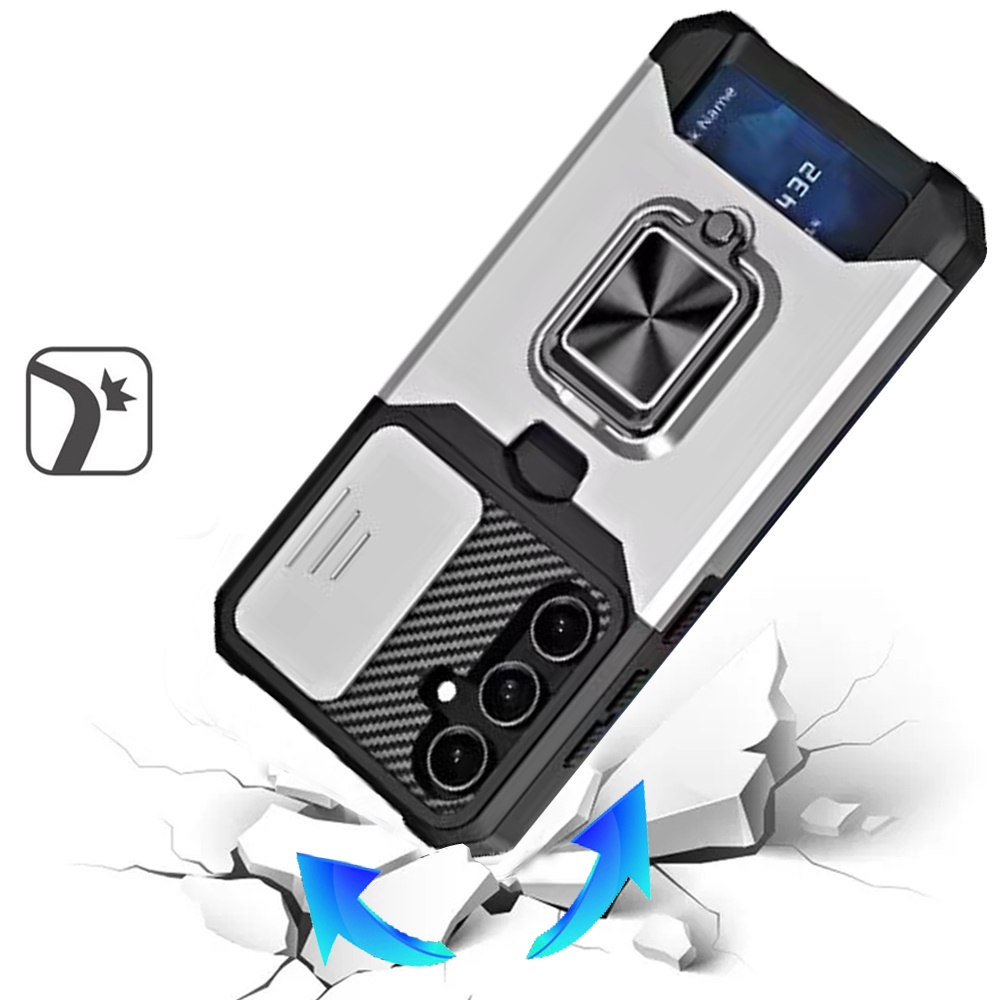 For Samsung s25 FE Multi-Functional Card Magnetic Ring Stand Hybrid Camera Case Cover - Silver