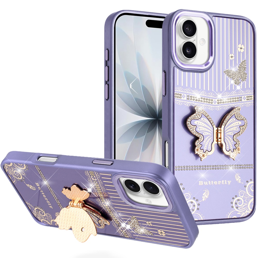 For iPhone 17 Splendid Glitter Butterfly Design Stand with Metallic Edges Hybrid Case - Dark Purple
