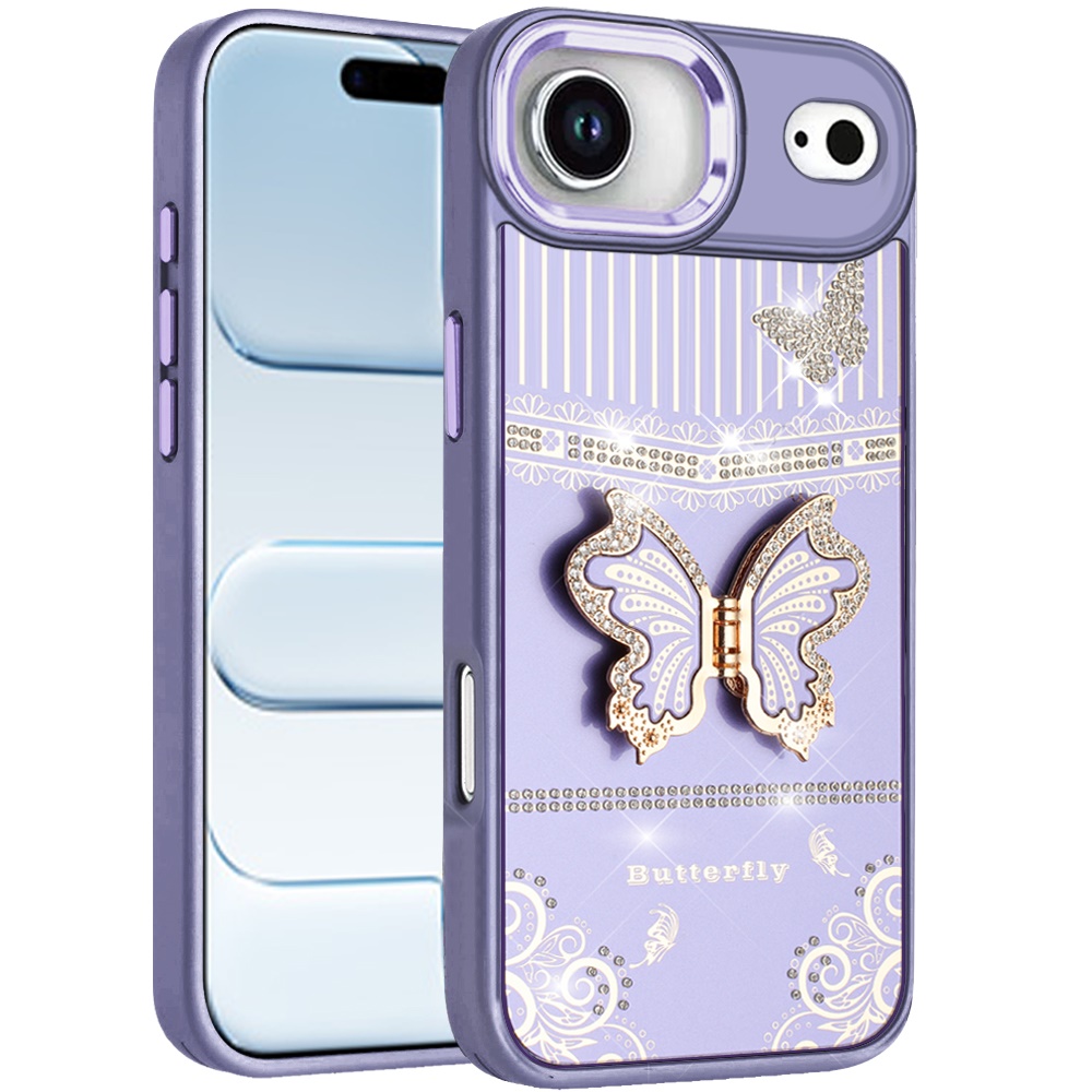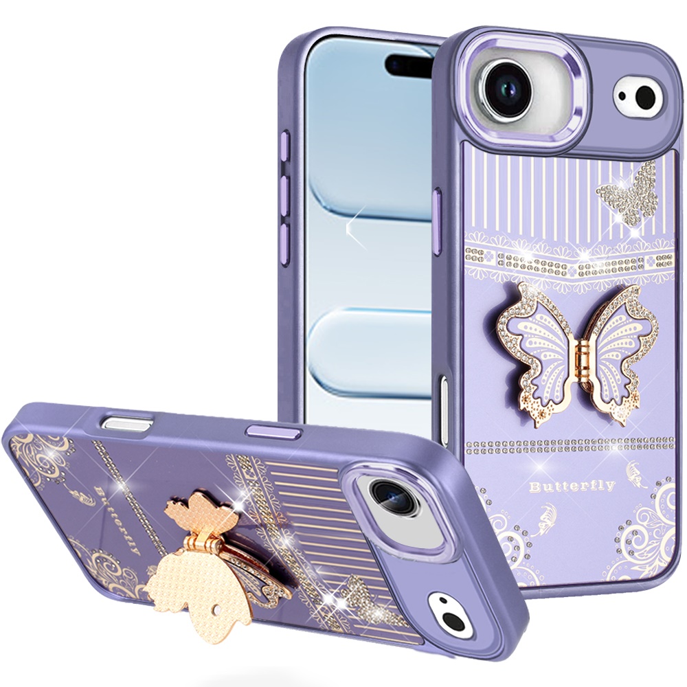 For iPhone 17 Air Splendid Glitter Butterfly Design Stand with Metallic Edges Hybrid Case - Dark Purple