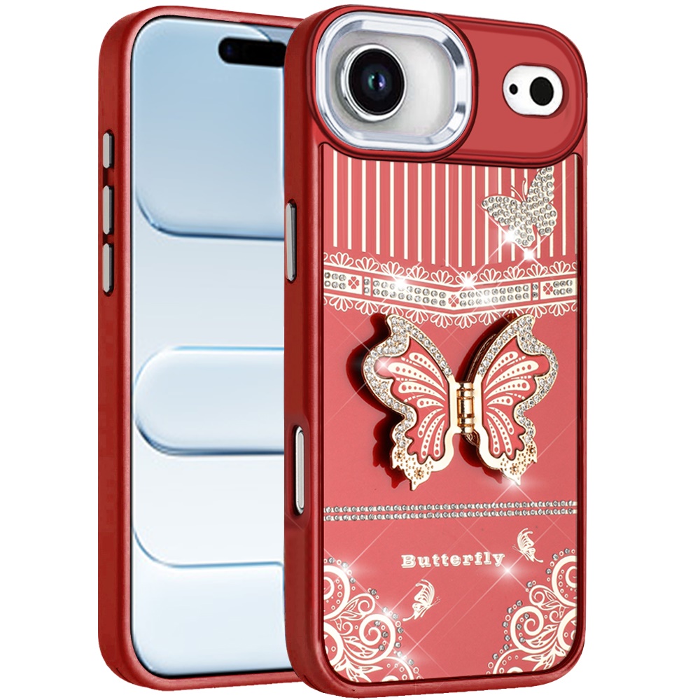 For iPhone 17 Air Splendid Glitter Butterfly Design Stand with Metallic Edges Hybrid Case - Red