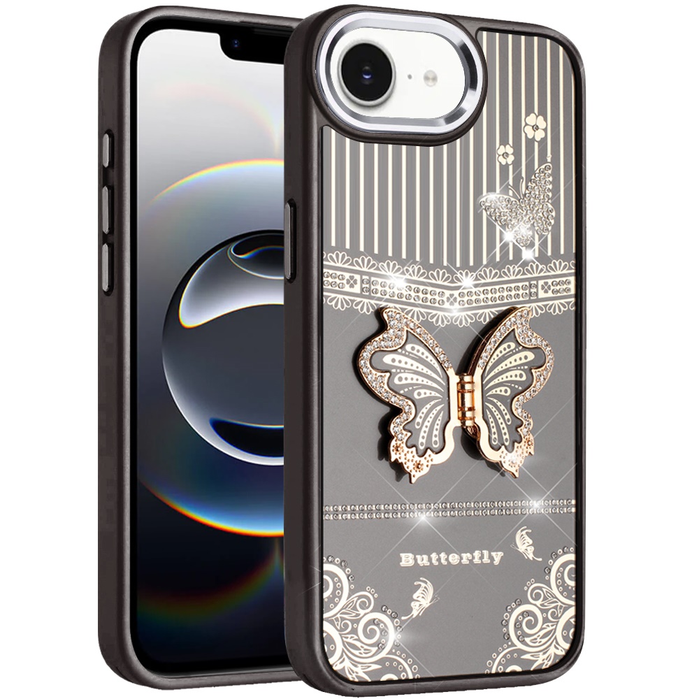 For iPhone 16E (E edition) / SE4 (2025) Splendid Glitter Butterfly Design Stand with Metallic Edges Hybrid Case - Black