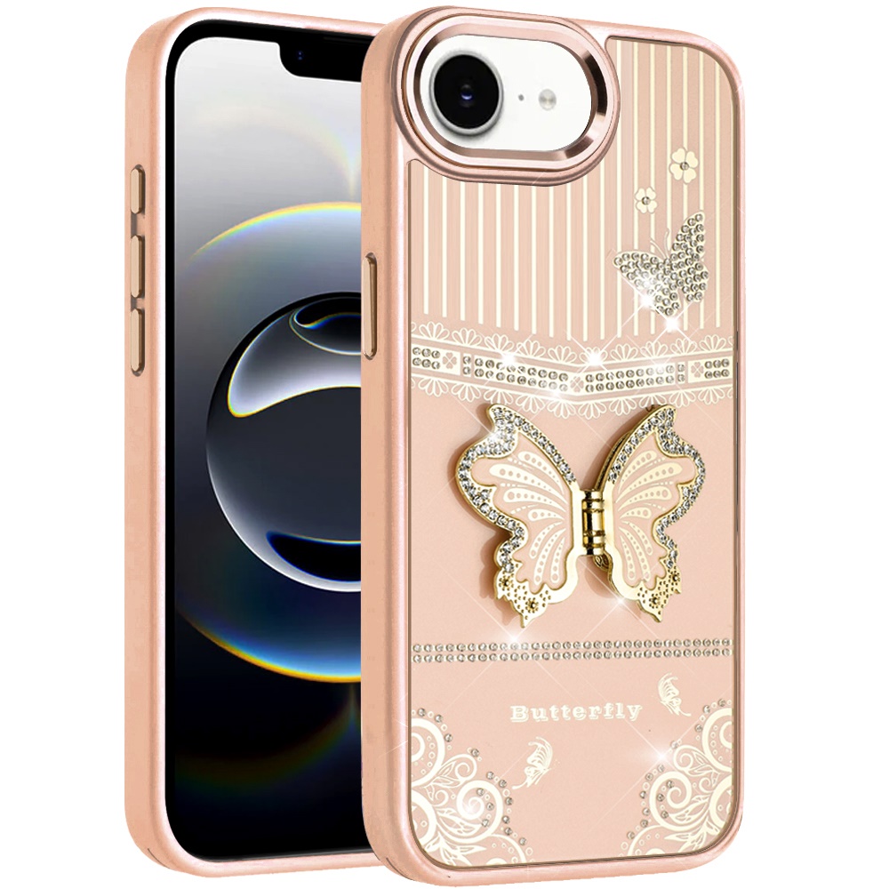 For iPhone 16E (E edition) / SE4 (2025) Splendid Glitter Butterfly Design Stand with Metallic Edges Hybrid Case - Gold
