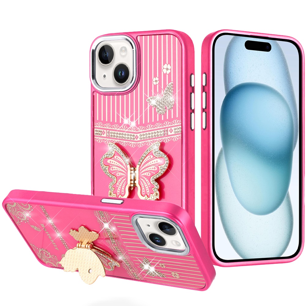 For iPhone 15 Splendid Glitter Butterfly Design Stand with Metallic Edges Hybrid Case - Hot Pink