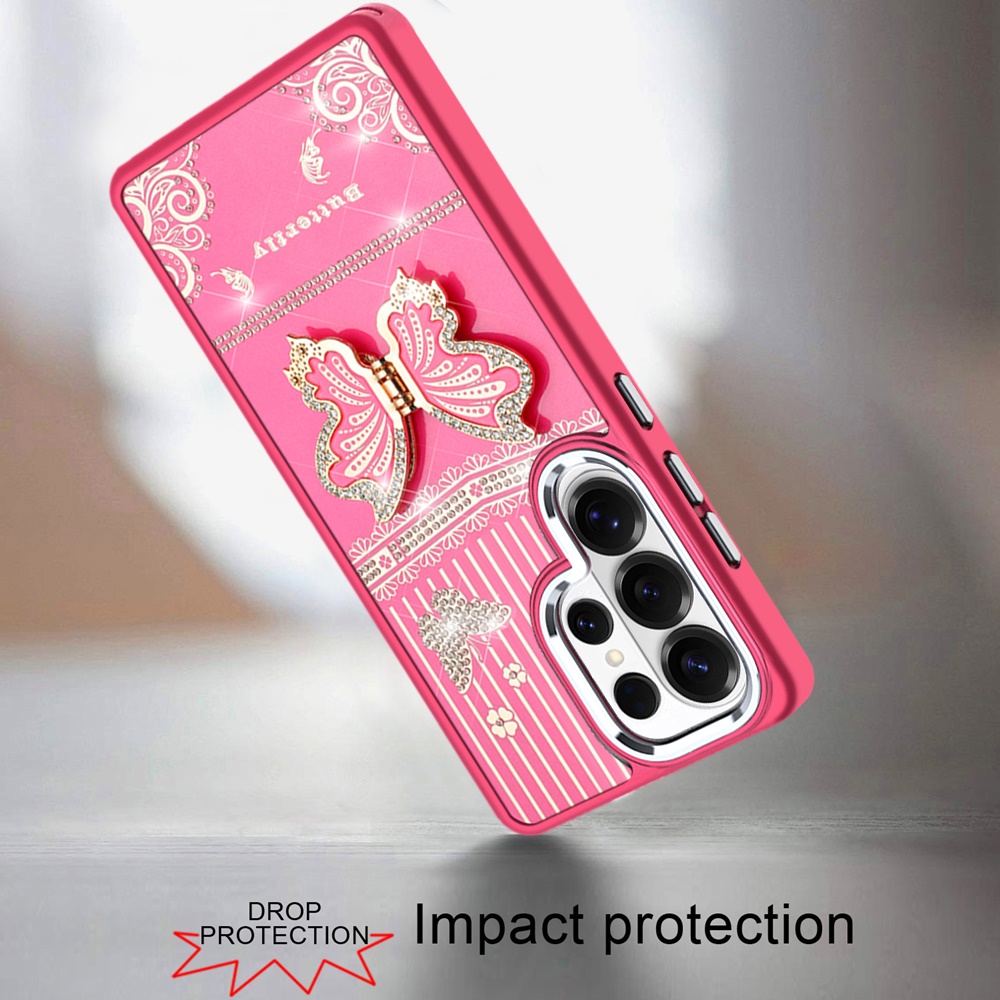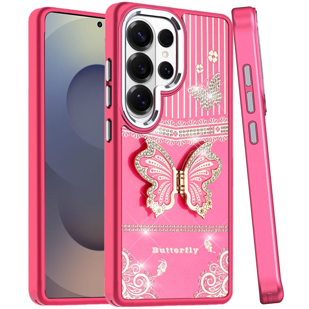 For Samsung s25 Ultra Splendid Glitter Butterfly Design Stand with Metallic Edges Hybrid Case - Hot Pink