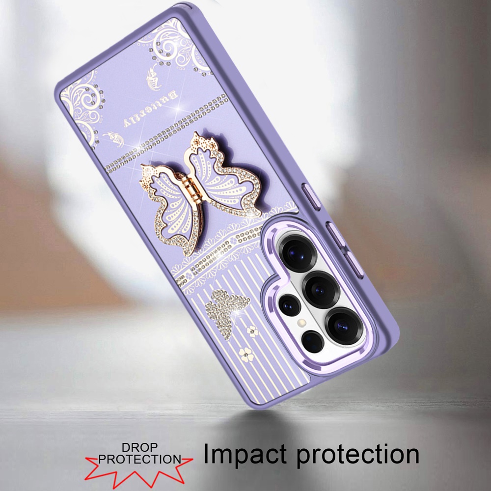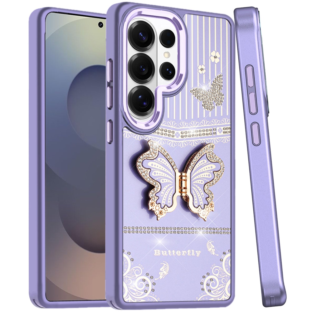For Samsung s25 Ultra Splendid Glitter Butterfly Design Stand with Metallic Edges Hybrid Case - Dark Purple