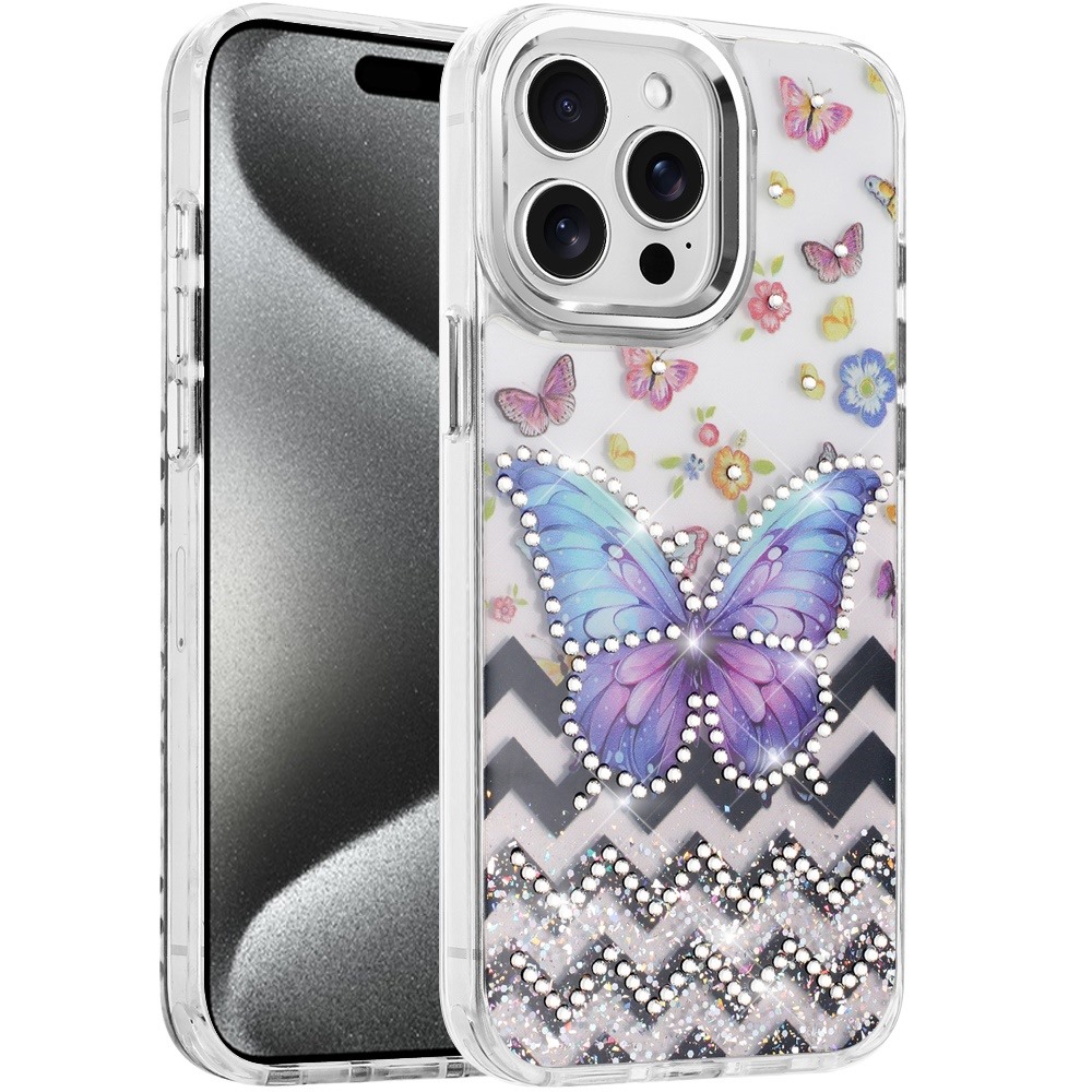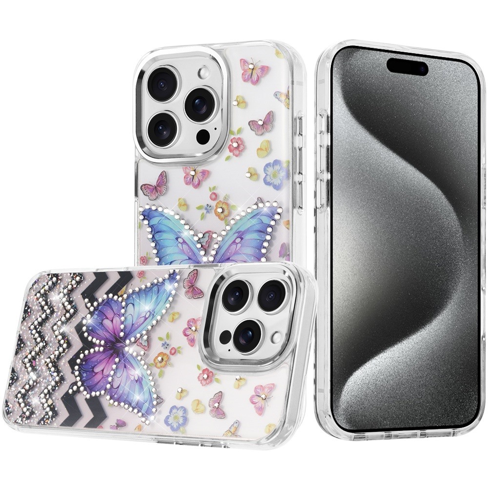 For iP15 Pro Max Resin Epoxy Design Diamond Metal Edged Hybrid Case - A