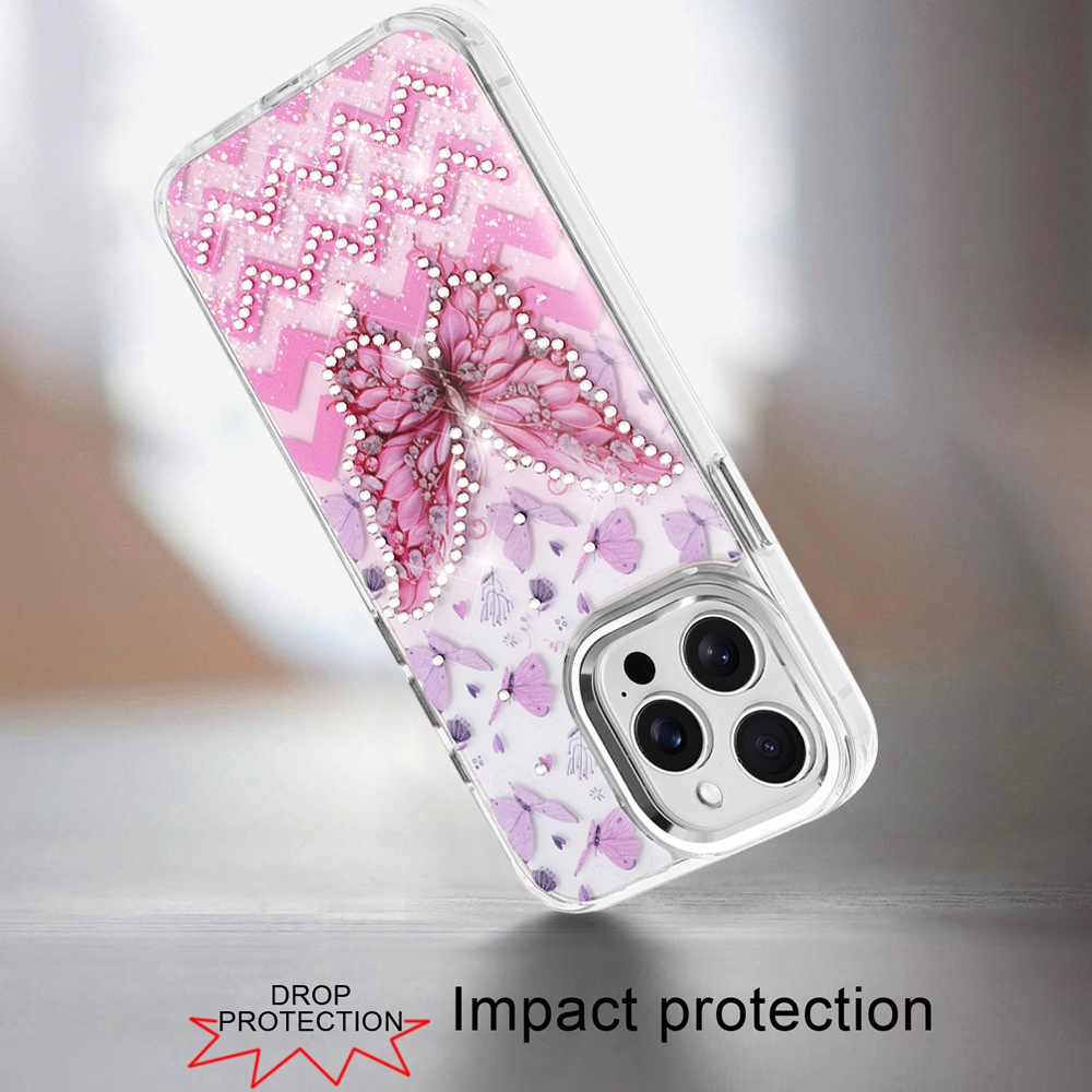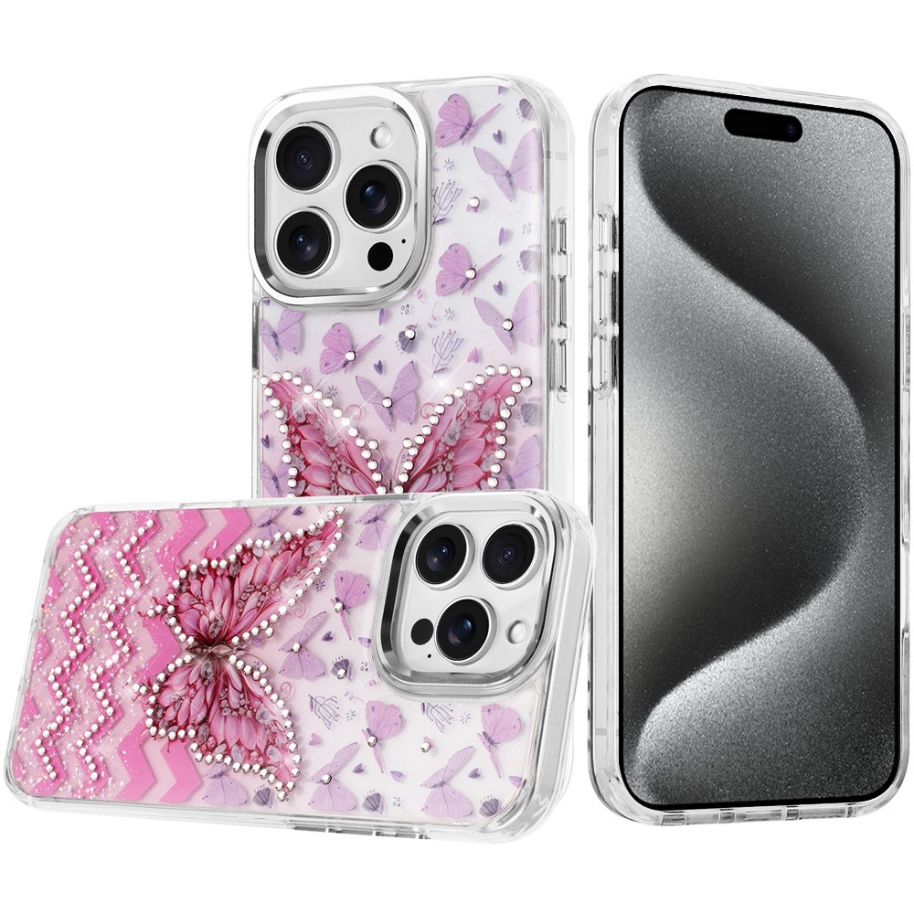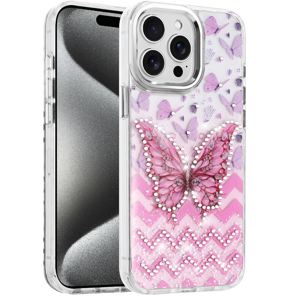 For iP15 Pro Max Resin Epoxy Design Diamond Metal Edged Hybrid Case - C