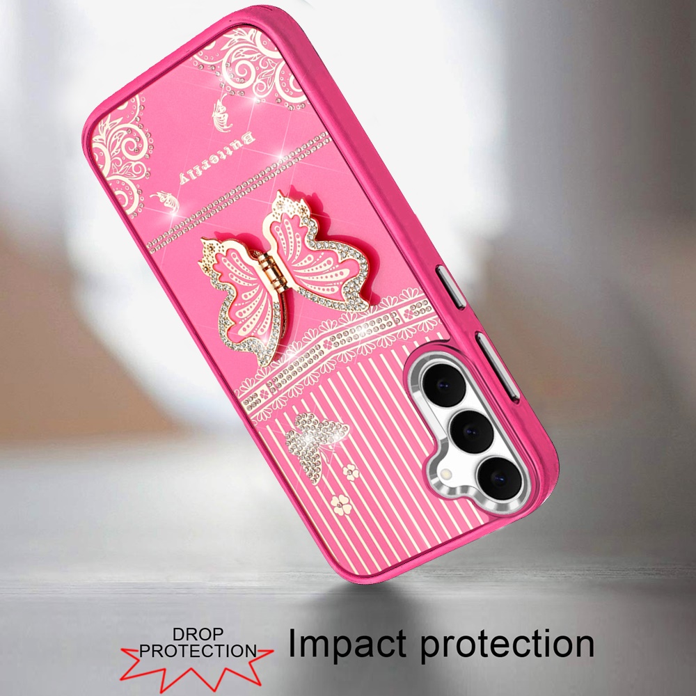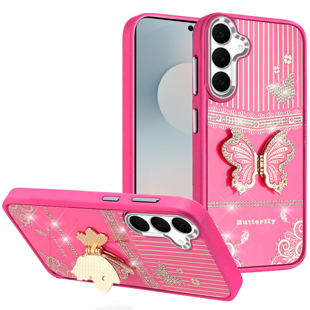 For Samsung s25 FE Splendid Glitter Butterfly Design Stand with Metallic Edges Hybrid Case - Hot Pink
