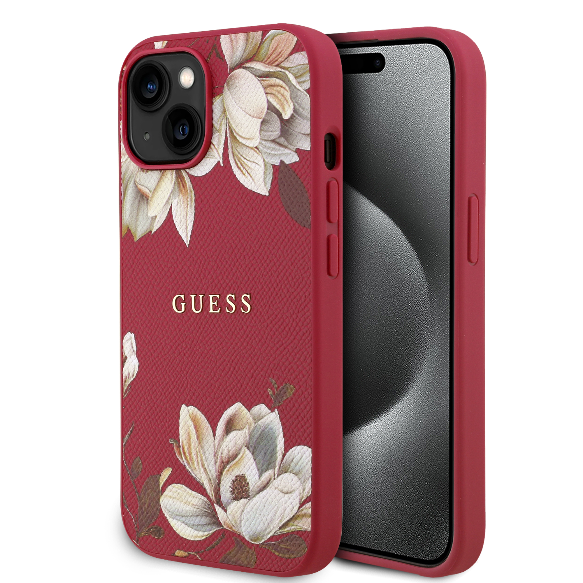 For iPhone 14 - GUESS HC O GRAINED PU PRINTED FLOWERS AND CLASSIC LOGO - Fuchsia (GUESS#157)