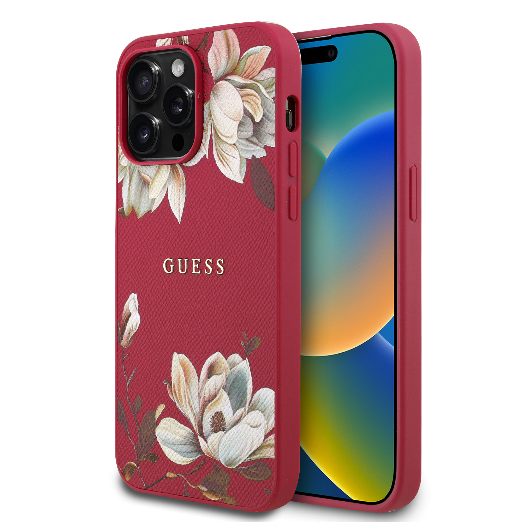For iPhone 14 Pro Max - GUESS HC O GRAINED PU PRINTED FLOWERS AND CLASSIC LOGO - Fuchsia (GUESS#169)
