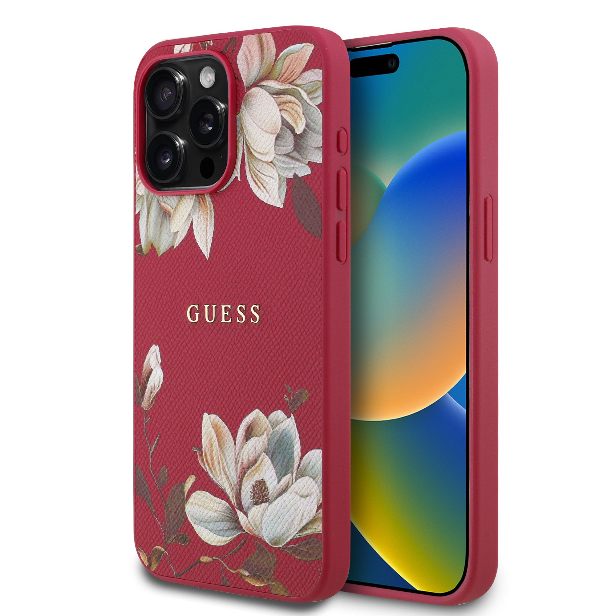 For iPhone 15 Pro Max - GUESS HC O GRAINED PU PRINTED FLOWERS AND CLASSIC LOGO - Fuchsia (GUESS#195)