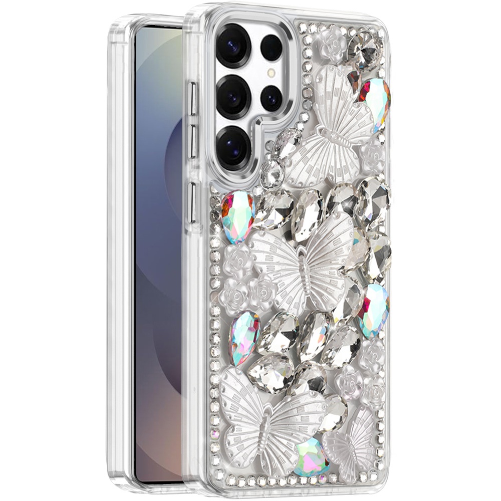 For Samsung s26 Ultra Lavished Floral Butterfly Bling Stones Hybrid Case - Silver