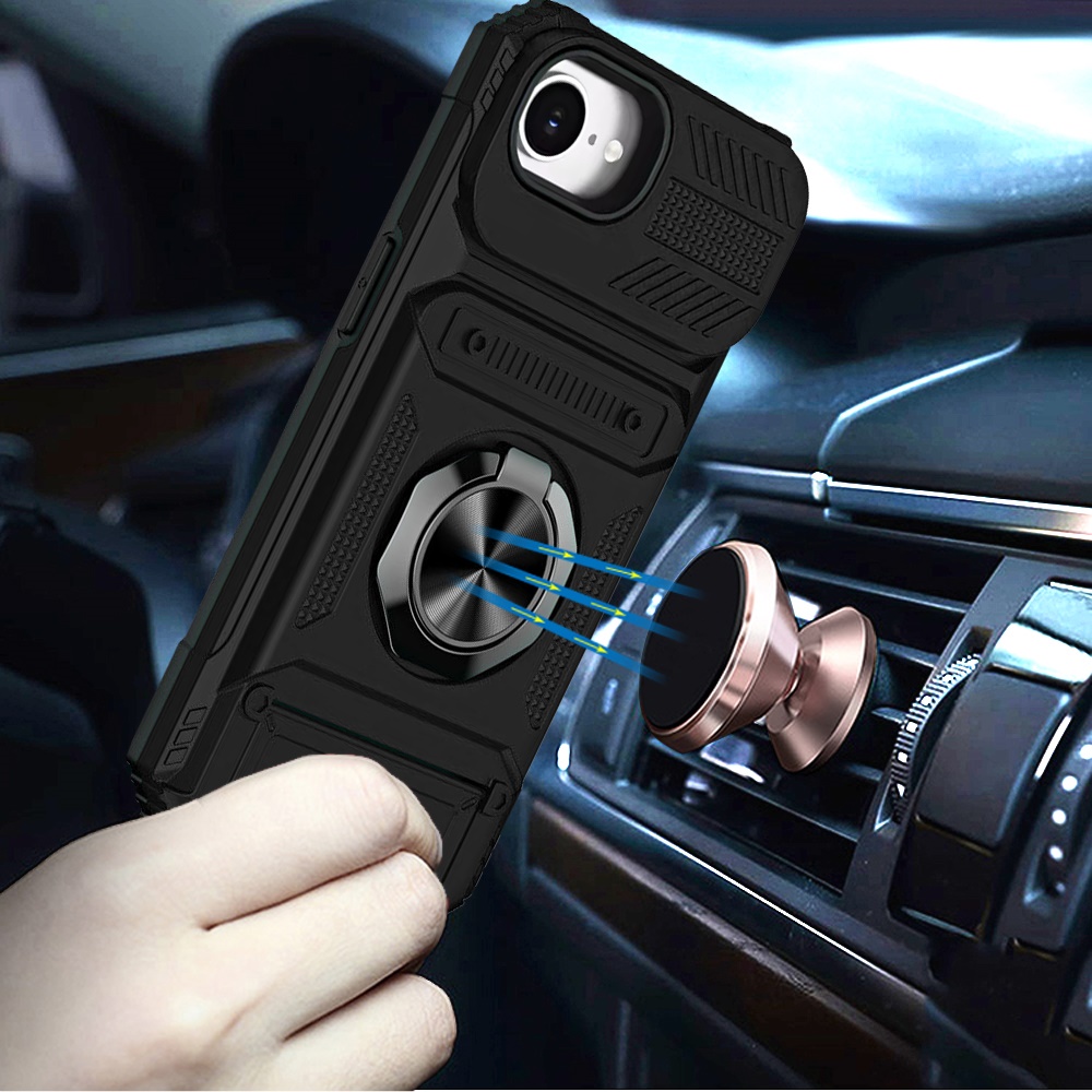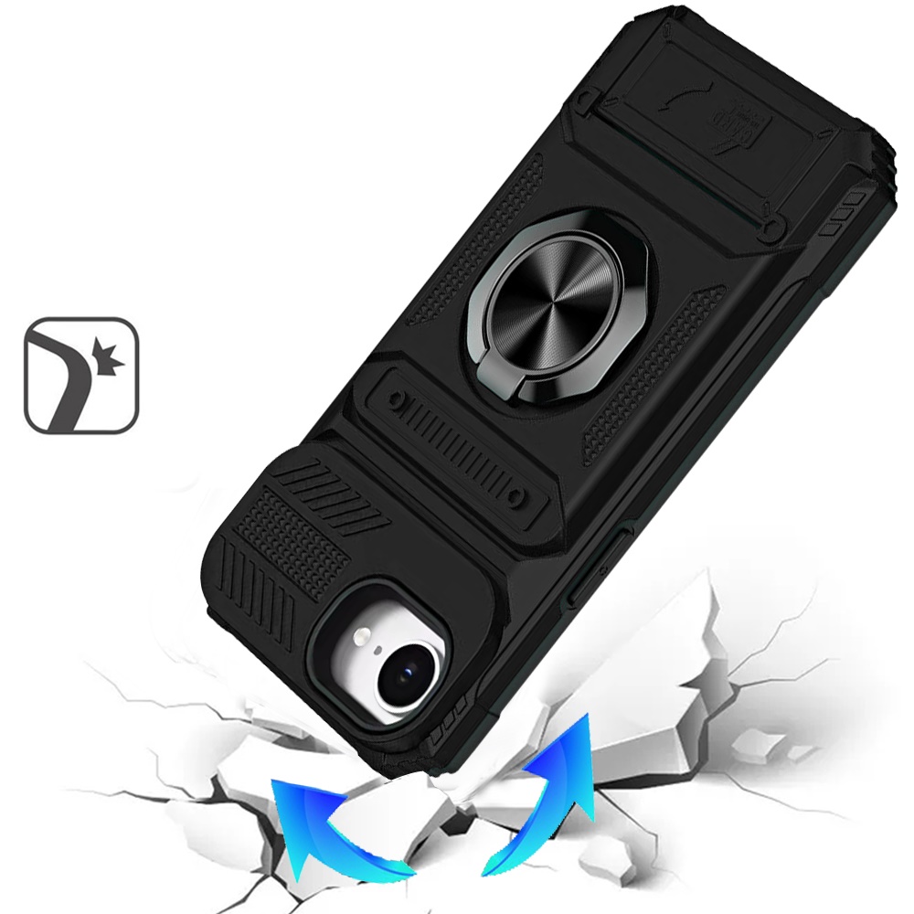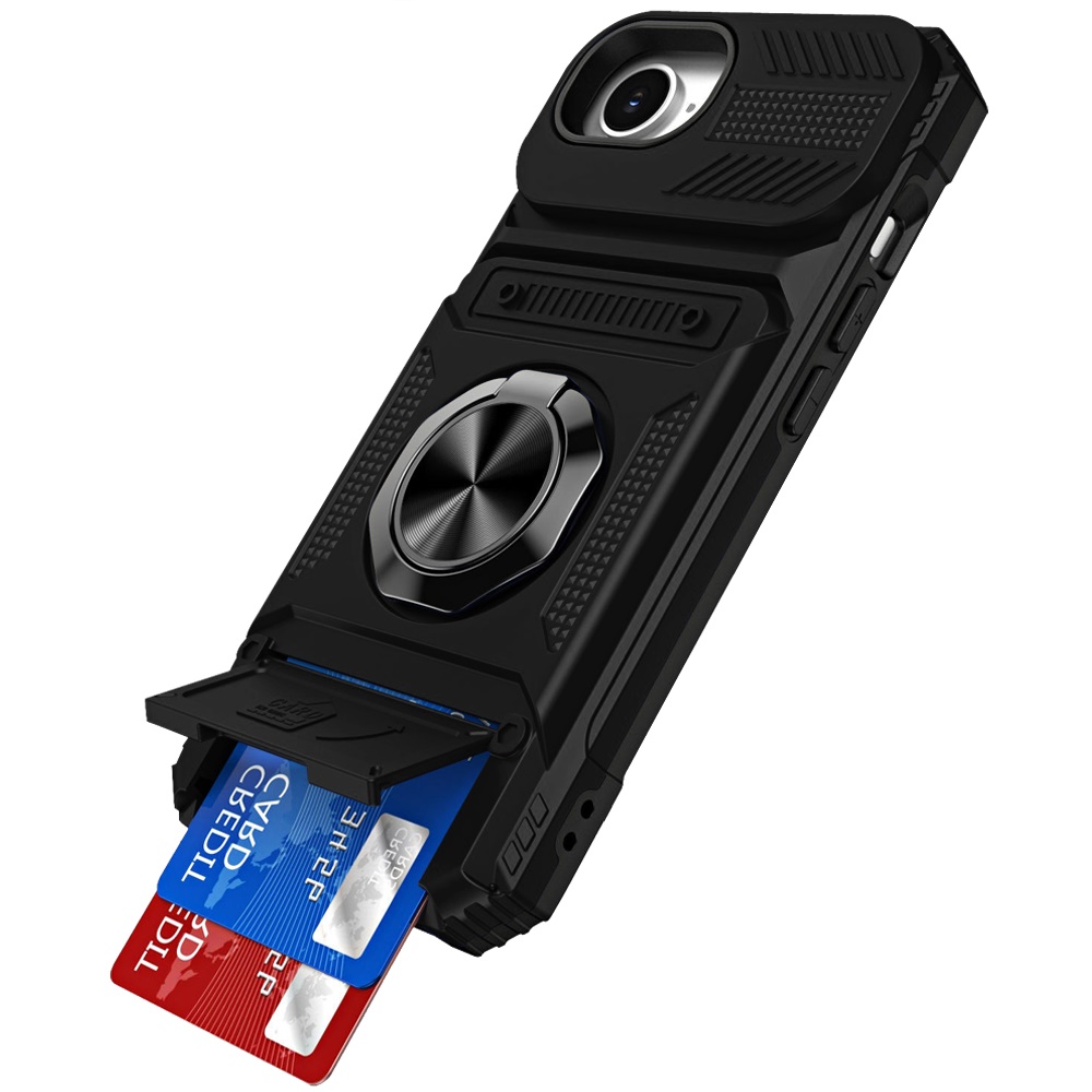 For iPhone 16E (E edition) / SE4 (2025) Multi-Functional 2X Card Slot Shockproof Metal Ring Hybrid Case - Black