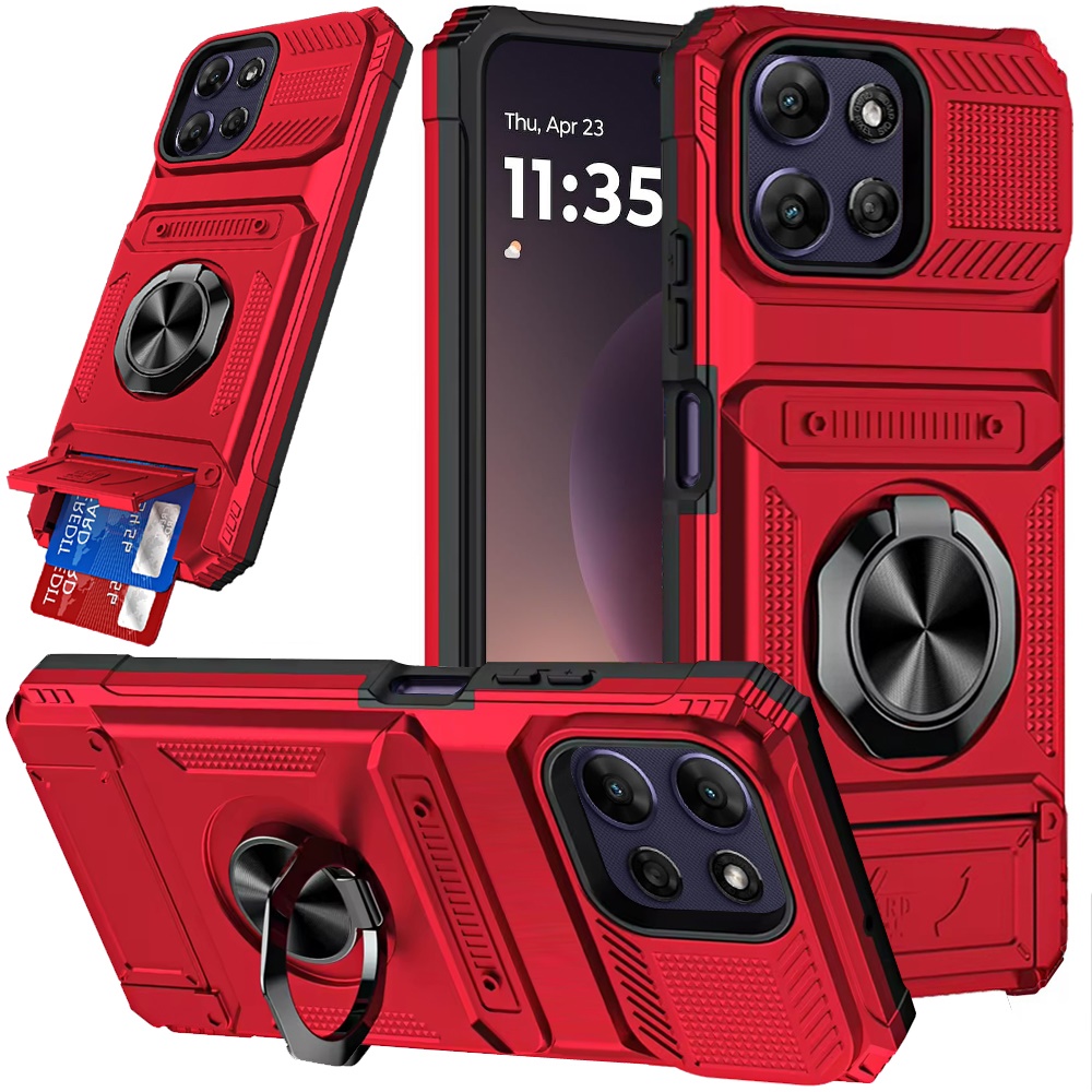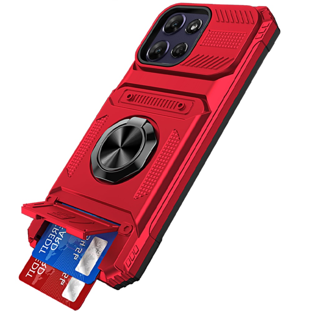 For Motorola Moto G Power 5G 2025 Multi-Functional 2X Card Slot Shockproof Metal Ring Hybrid Case - Red