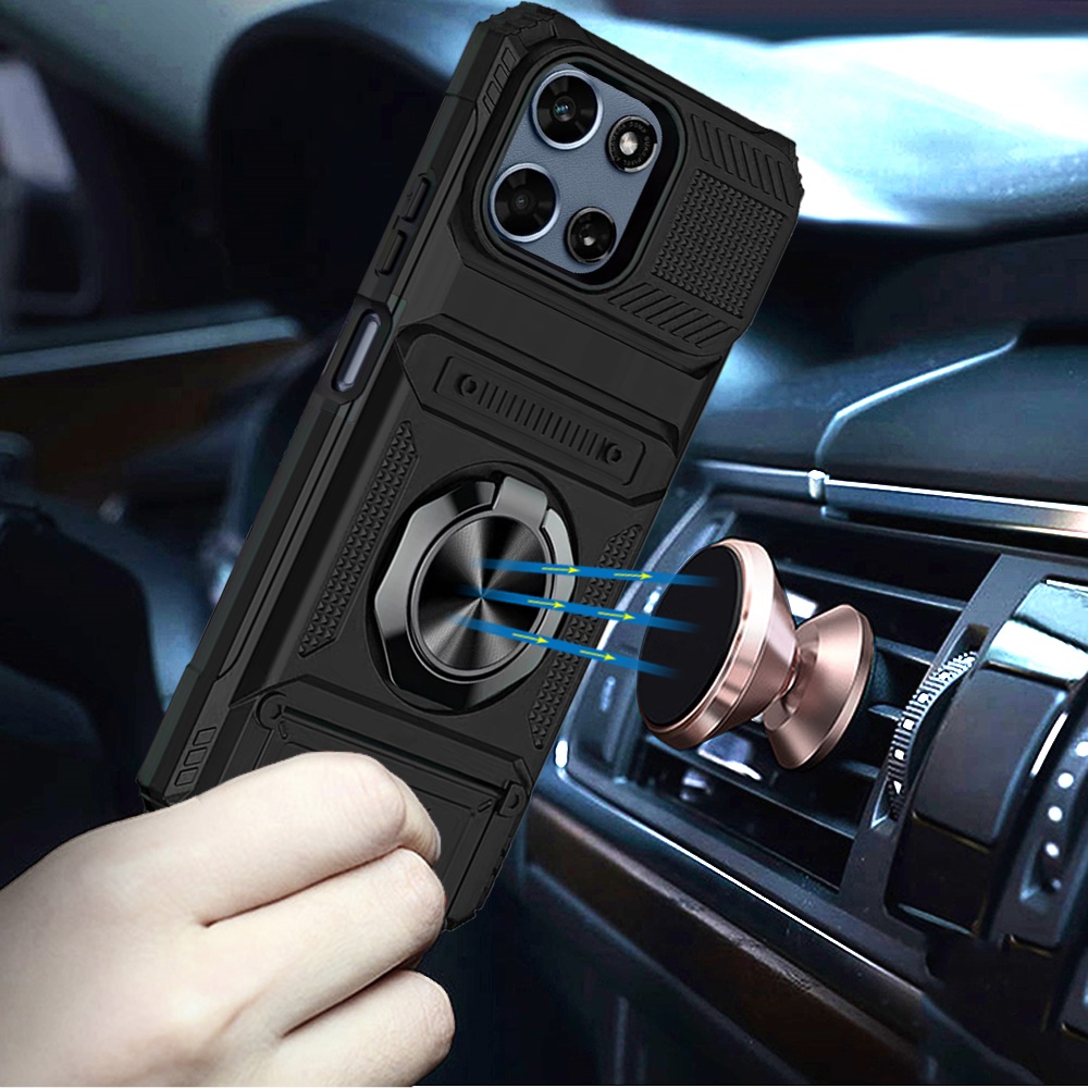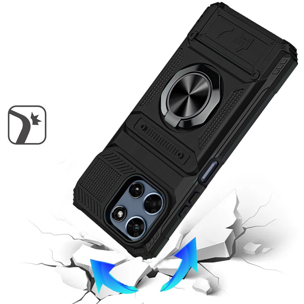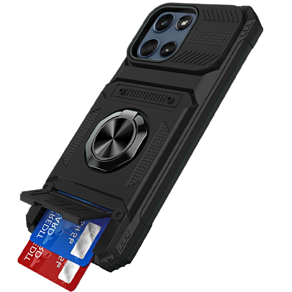 For Motorola Moto G 5G 2025 Multi-Functional 2X Card Slot Shockproof Metal Ring Hybrid Case - Black