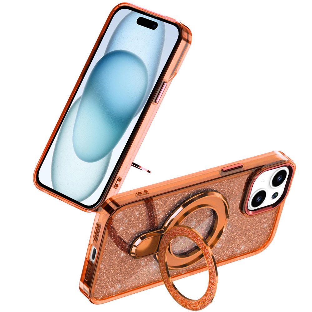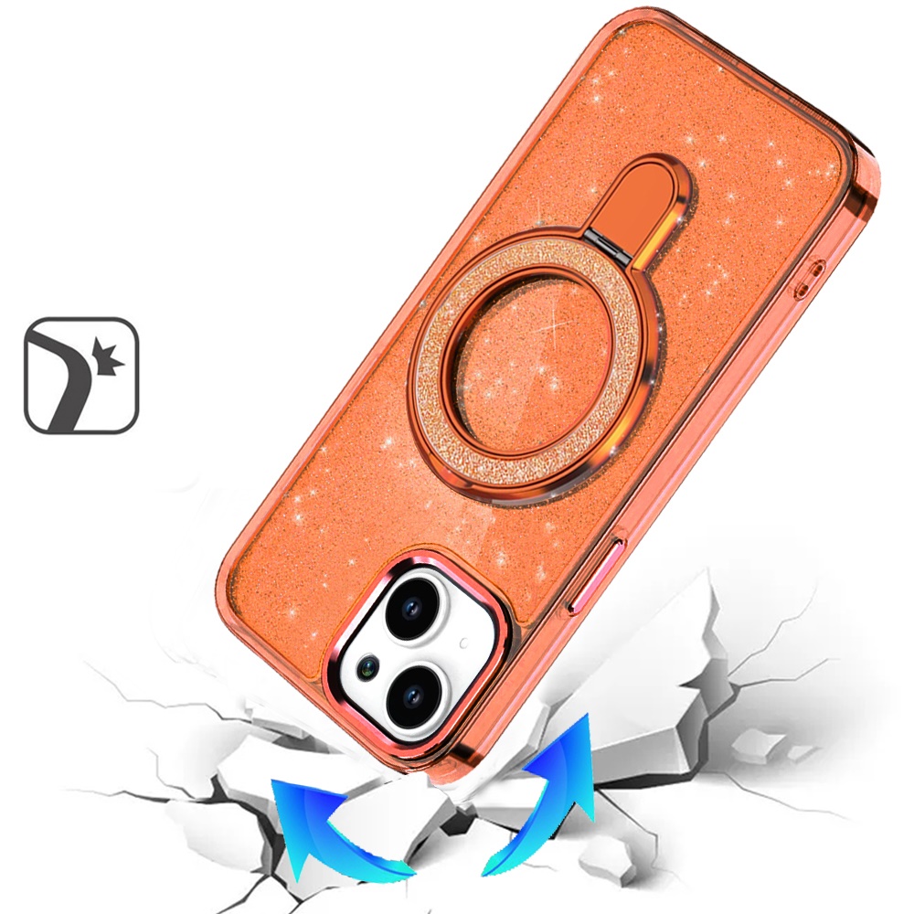 For iPhone 15 Plus/iPhone 14 Plus Transparent Glitter Rotaional Magnetic Ring Stand HQ Hybrid - Cosmic Orange