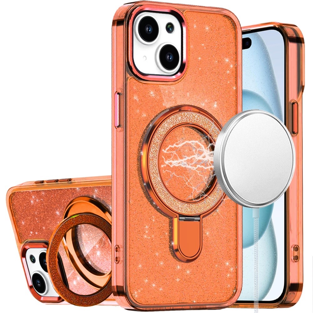 For iPhone 15 Transparent Glitter Rotaional Magnetic Ring Stand HQ Hybrid - Cosmic Orange