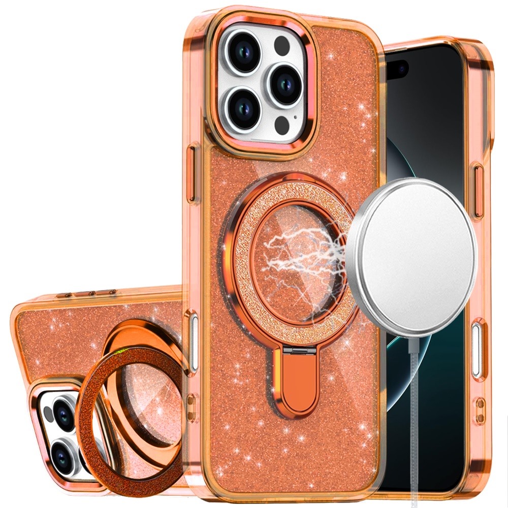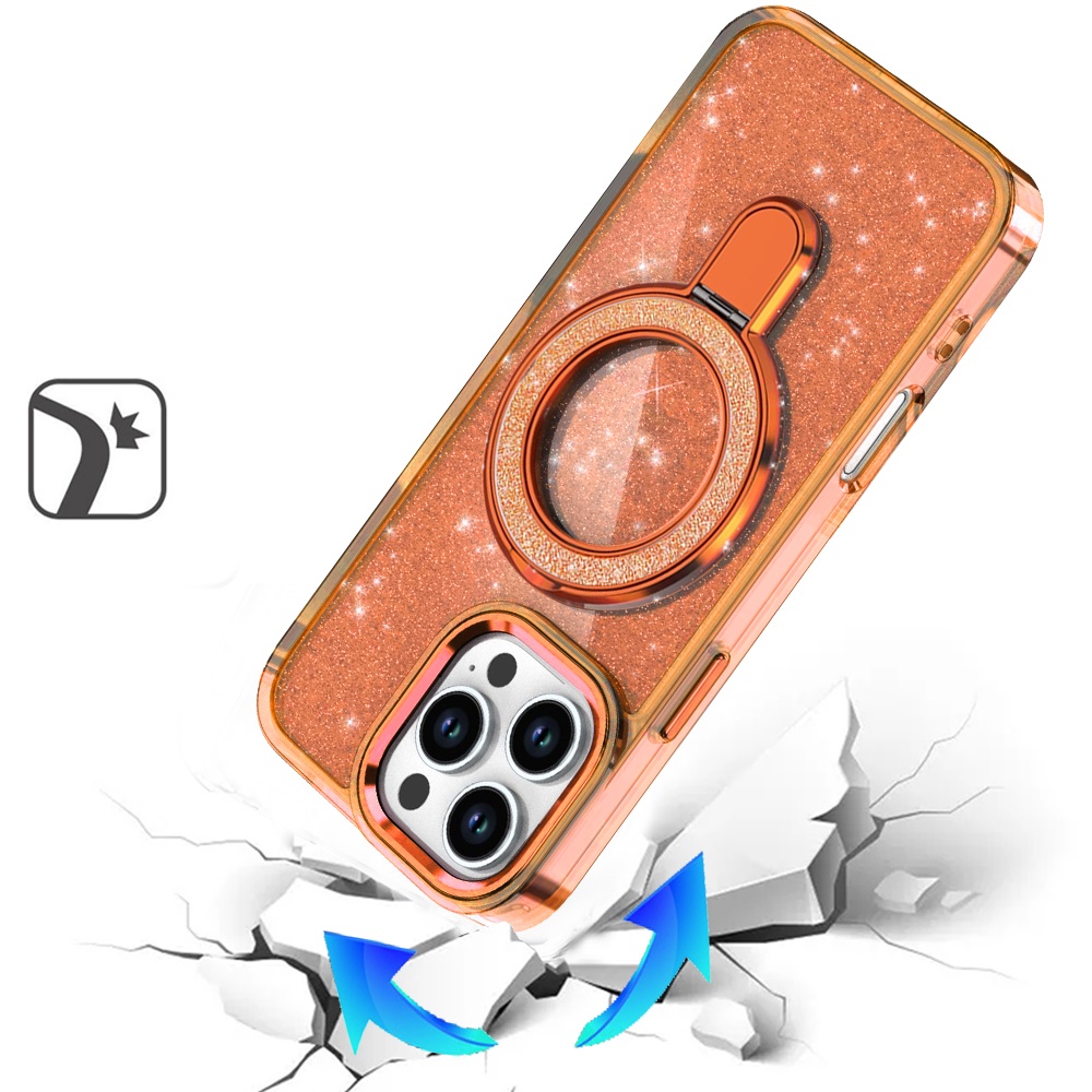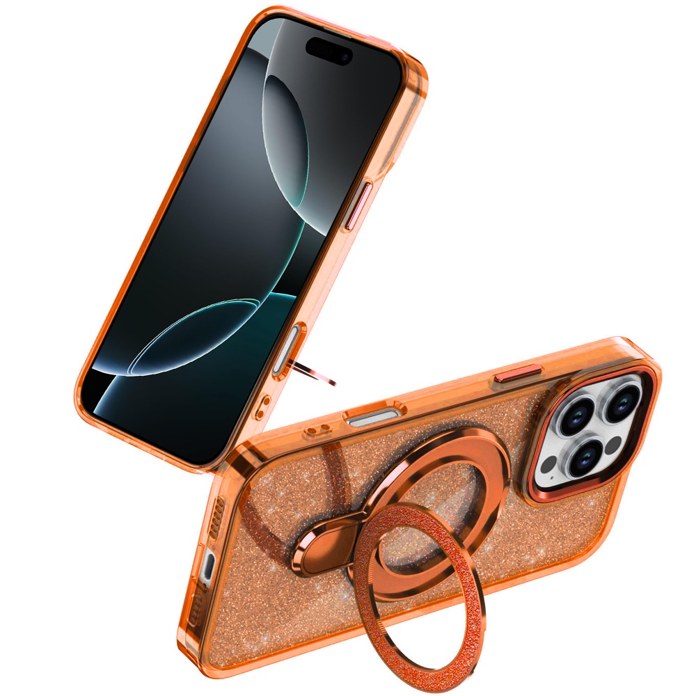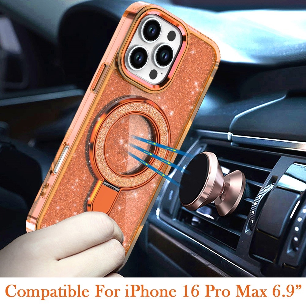 For iPhone 16 Pro Max 6.9 inch Transparent Glitter Rotaional Magnetic Ring Stand HQ Hybrid - Cosmic Orange