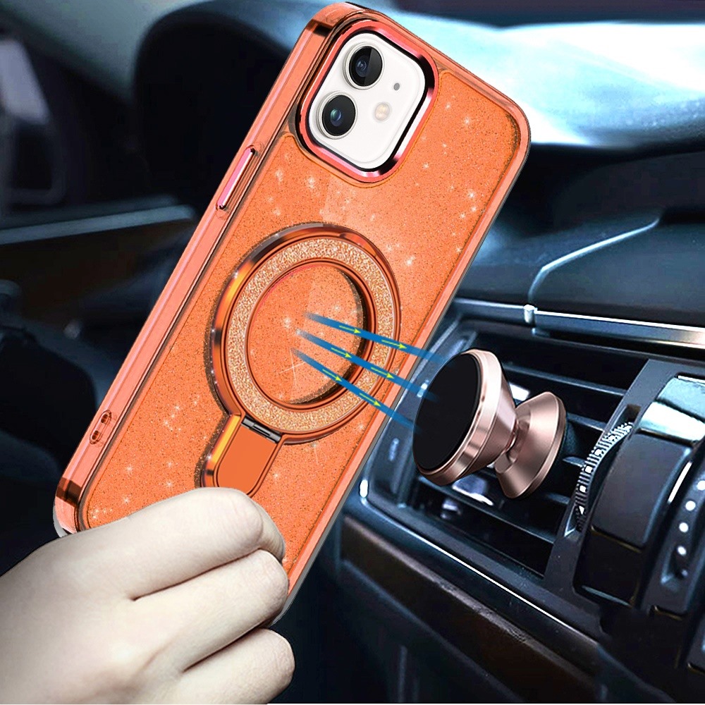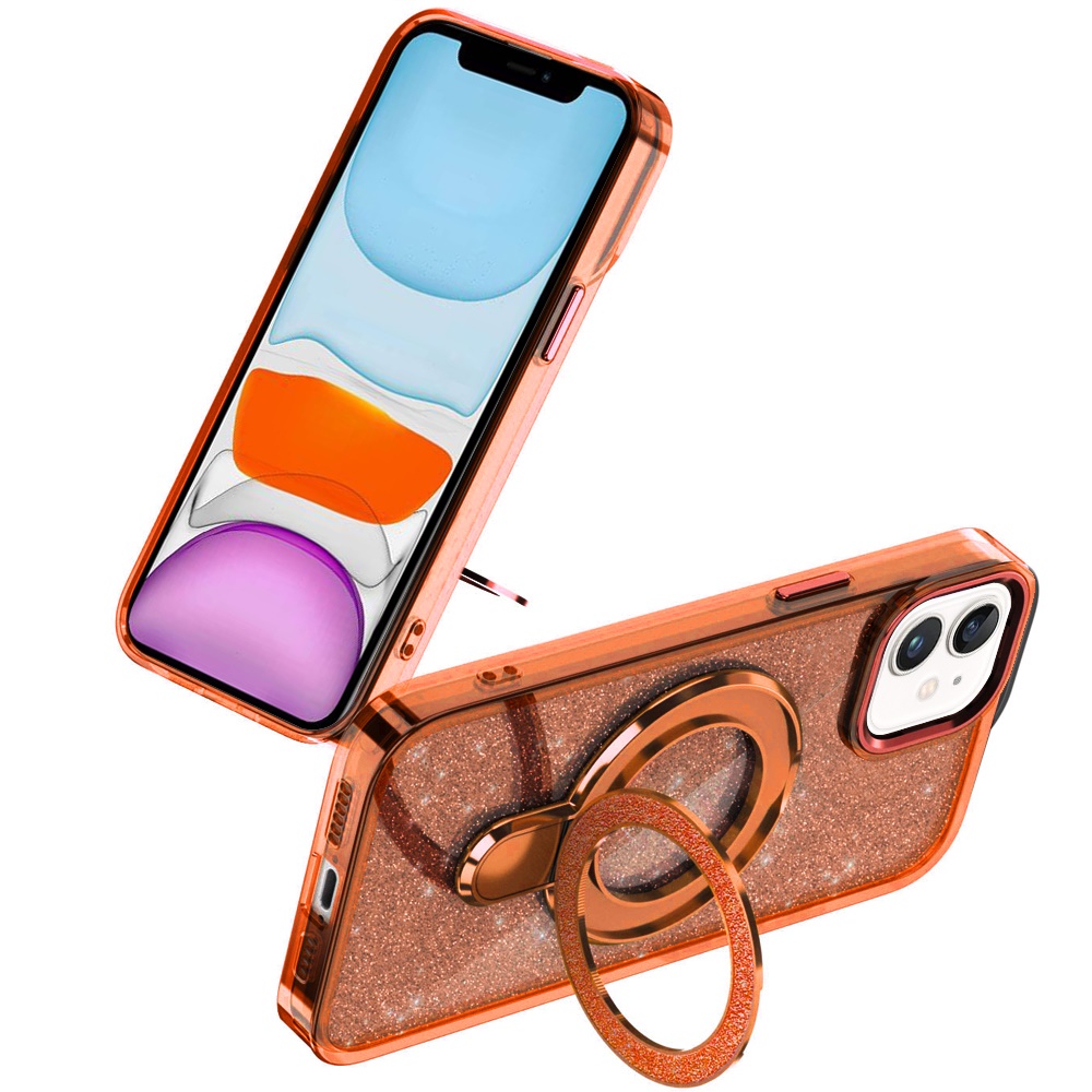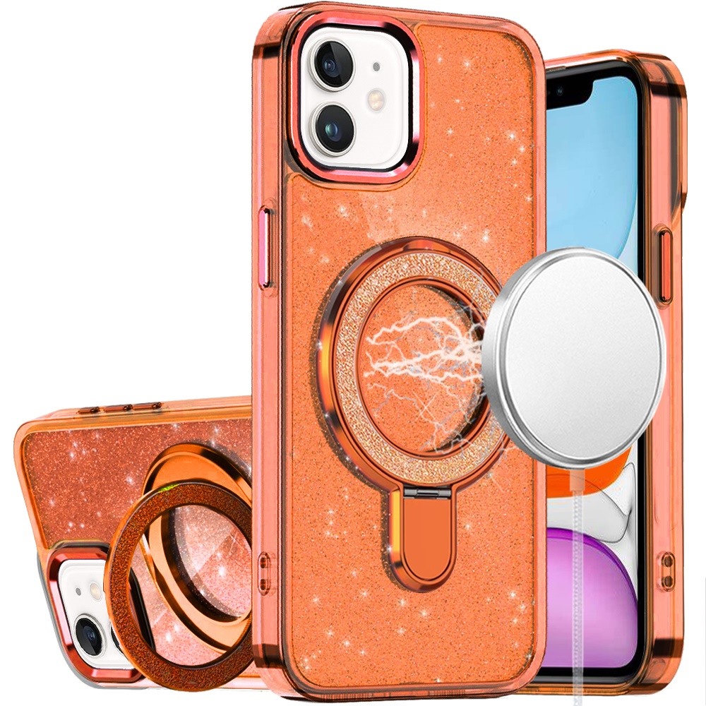 For iPhone 11 (XI6.1) Transparent Glitter Rotaional Magnetic Ring Stand HQ Hybrid - Cosmic Orange