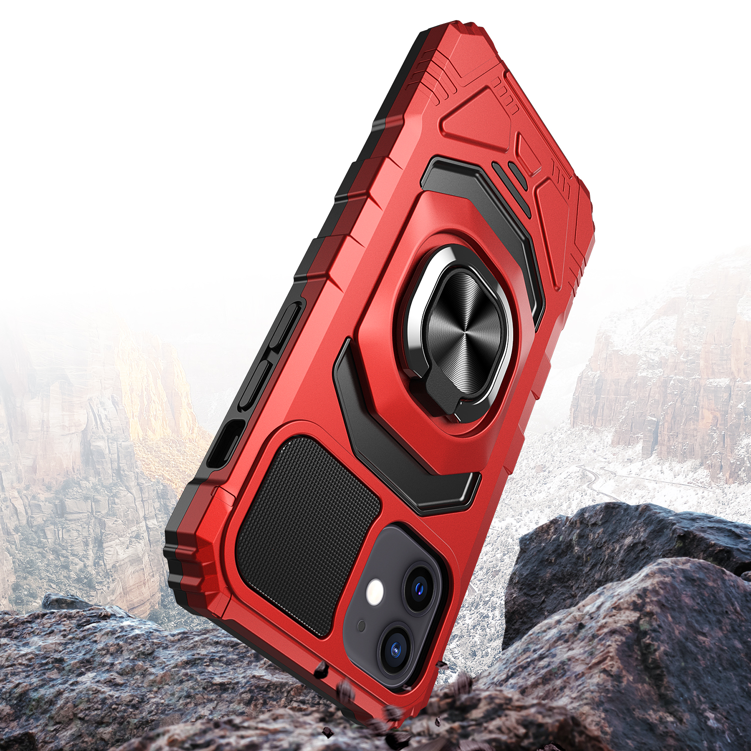 For iPhone 12 & iPhone 12 Pro (Open Camera Hole) Robotic Hybrid with Magnetic Ring Stand Case Cover - Red